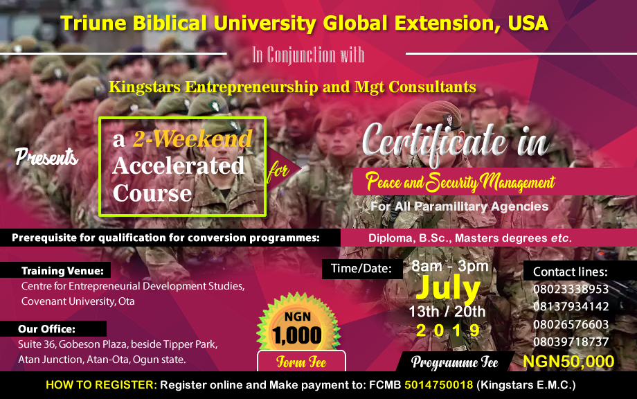 16 Jun Pre-register for A 2-weekend Accelerated Course slated for July 4151 Views 0 Likes This is to bring to the notice of the general public that we will be holding a 2-weekend accelerated course in the month of July, 2019. Please, find below the image that explains full details of the programme: Share: